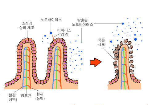 하지만 노로바이러스처럼 외피가 없는 바이러스는 위를 무사히 통과하여 소장 세포에 침입할 수 있다. 노로바이러스는 소장 세포 안에서 증식하여 많은 수로 불어난 후에 세포 밖으로 방출되고, 소장 세포는 죽는다. 그러면 소장 세포들이 영양소나 수분을 흡수할 수 없으므로 설사가 일어나는데, 이 설사로 나온 배설물에는 많은 노로바이러스가 남아있다.